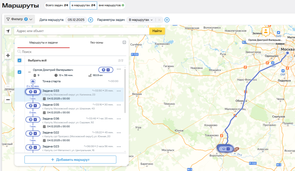 из задач на карте в окне маршрутов раскрывается маршрут, в который она входит и