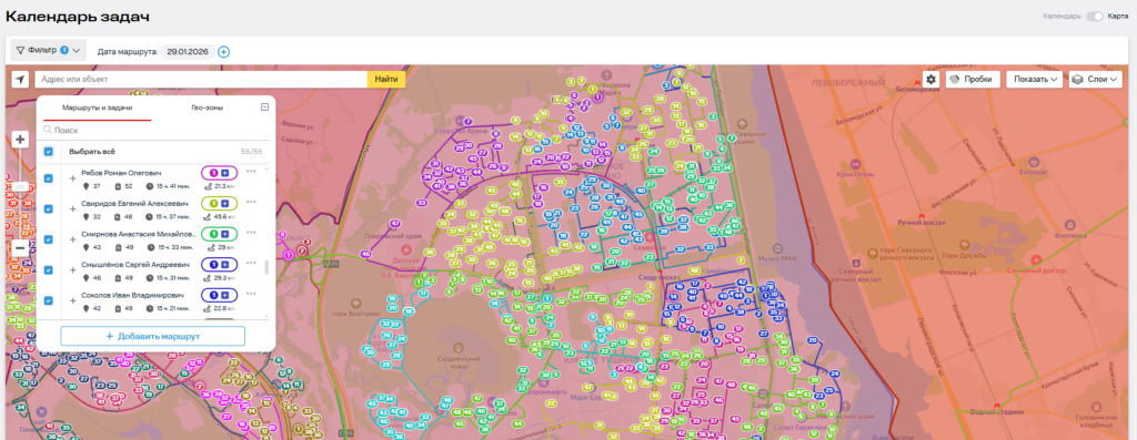 маршруты с задачами ваших сотрудников. Также как и в режиме календаря вы можете