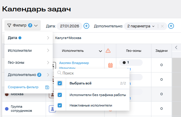 проставлен «Нет». Включить отображение неактивных исполнителей можно в фильтре