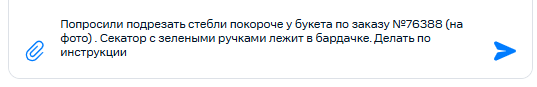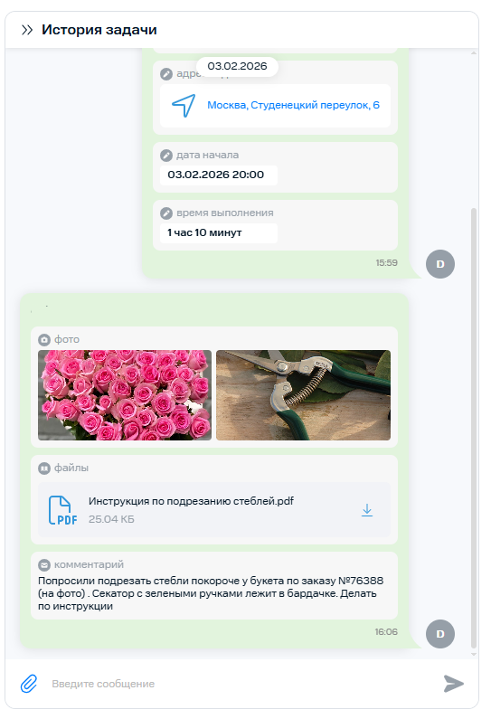 Чтобы отправить сообщение в истории задачи, нужно в поле для ввода сообщения написать необходимую информацию и затем нажать на значок для отправки сообщения.