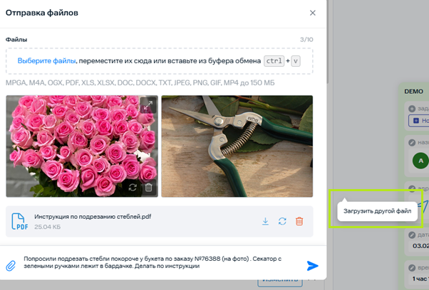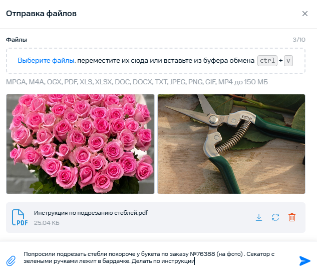 Кроме того, к сообщению можно прикрепить файлы и/или изображения, нажав на значок скрепки. Поддерживаемые форматы прикрепляемых файлов и изображений: MPGA, M4A, OGX, PDF, XLS, XLSX, DOC, DOCX, TXT, JPEG, PNG, GIF, MP4 до 150 МБ.