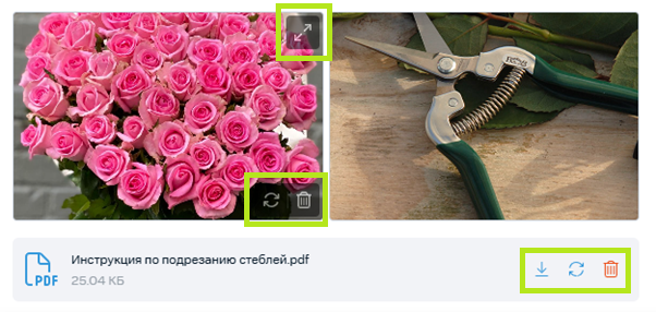 просмотра, загрузить другой файл вместо уже прикрепленного, а также удалить все