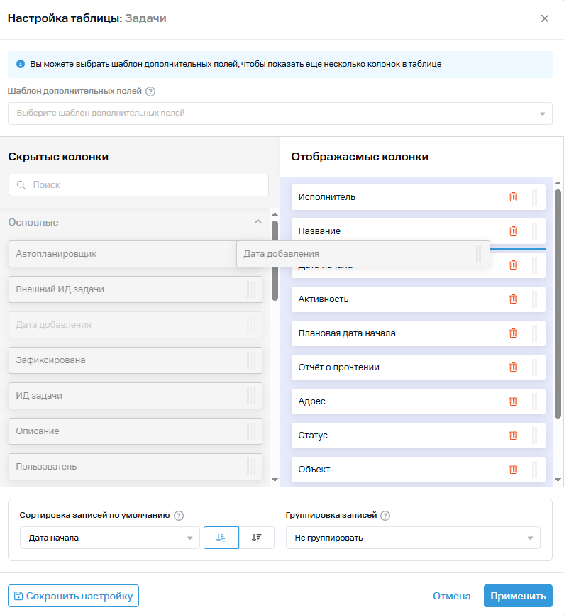 Для перехода к окну настройки отображения колонки с датой добавления задачи необходимо в правом верхнем углу нажать на значок шестренки, выбрать «Настроить колонки» и перетащить блок «Дата добавления» из скрытых в отображаемые или наоборот (в зависимости от того, хотите ли вы, чтобы колонка с датой добавления задачи отображалась на странице).