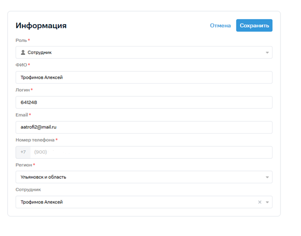 сотрудника на странице пользователя. Для этого на странице нужного пользователя