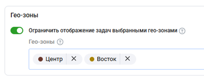 - В блоке Гео-зоны вы можете включить отображение на бирже задач только из определенных гео-зон.