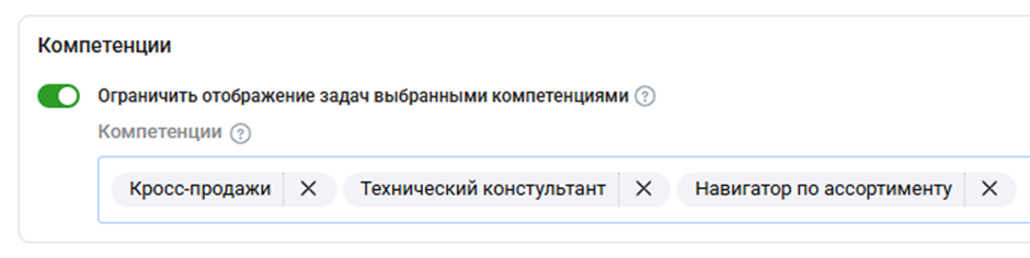 - В блоке Компетенции вы можете включить отображение на бирже задач только с определенными компетенциями.