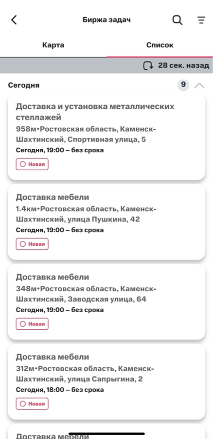 Сотрудник будет видеть только те задачи, которые соответствуют заданным в веб-интерфейсе параметрам. Например, в настройках биржи указан радиус задач от текущего местоположения исполнителя 10 км и выбрано отображение задач только со статусом «Новая». Это означает, что сотруднику для выбора будут доступны только задачи, которые находятся на расстоянии не больше 10 км от него и которые находятся в статусе «Новая».