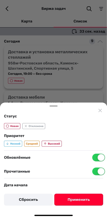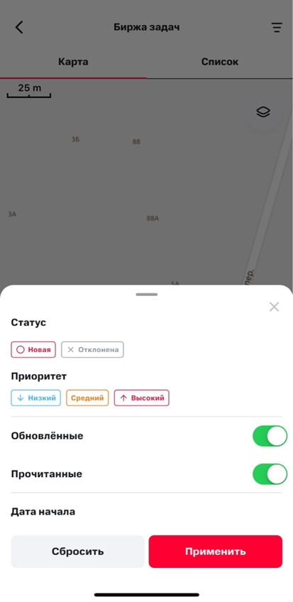 И во вкладке Карта, и во вкладке Список задачи с Биржи можно отфильтровать по различным параметрам. Для этого необходимо нажать на кнопку в верхнем правом углу и применить нужные настройки фильтра.