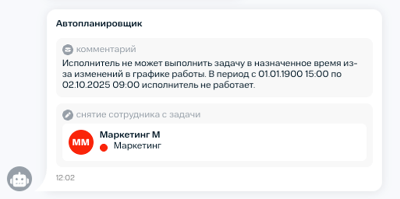 В истории задачи обновили комментарий, который отображается при проставлении недоступности сотрудника. Теперь при изменениях в графике работы сотрудника в комментарии указывается период, в который исполнитель не работает.
