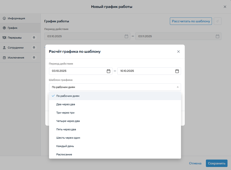 - В окне расчета графика по шаблону выберите период действия дежурства. В поле «Шаблон графика» выберите нужный шаблон из списка.