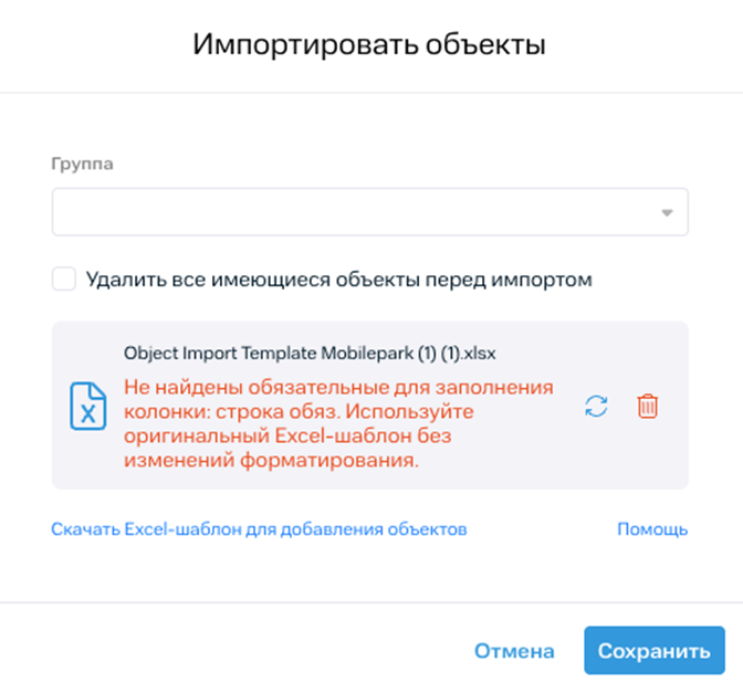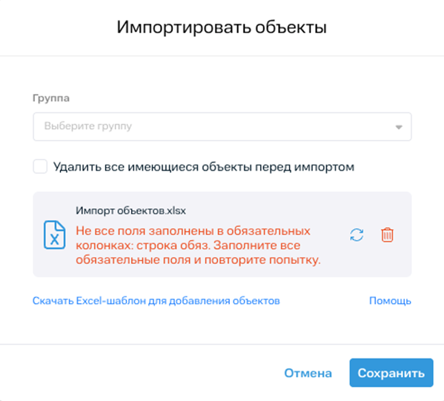 Сделали более понятной валидацию импорта объектов. Теперь при добавлении объектов в систему с помощью Excel-шаблона в зависимости от того, были ли добавлены/заполнены обязательные поля, отображаются сообщения с подробной информацией.
