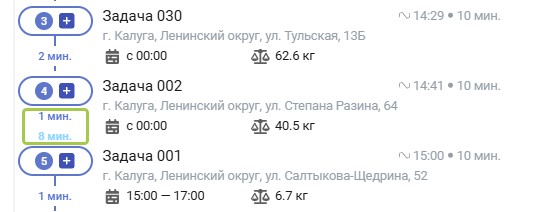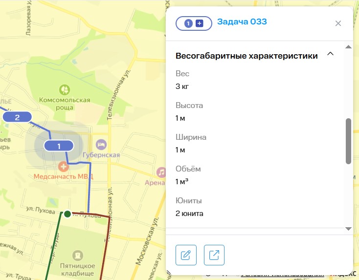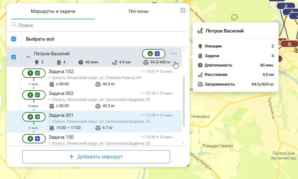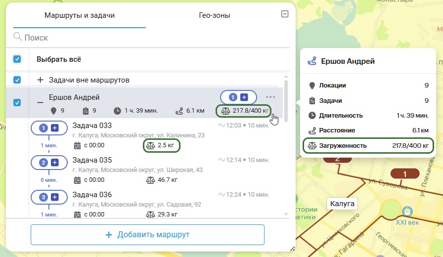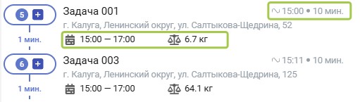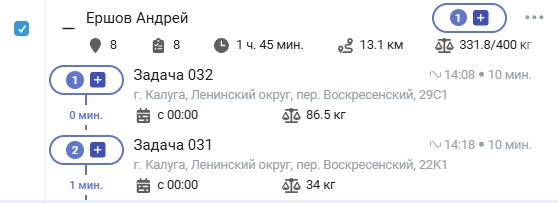 Теперь в списке маршрутов и в карточке задачи отображаем весогабаритные характеристики задачи, а также загруженность сотрудника. Это помогает быстрее оценить, кому можно добавить ещё одну задачу, а чей маршрут уже заполнен.