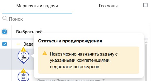 Для просмотра причины раскройте блок Задачи вне маршрутов и наведите курсор на значок задачи.