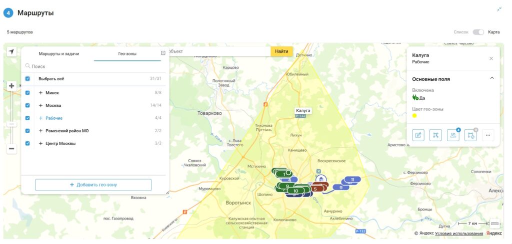 Добавили возможность просмотра гео-зон на последнем шаге построения маршрутов, чтобы проще было проверить, правильно ли распределились задачи и не оказались ли они за пределами нужных зон.