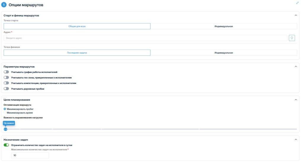 Сделали шаг с настройкой опций маршрута более удобным, объединили опции по группам, добавили возможность ограничить количество задач, назначаемых на одного сотрудника в день.