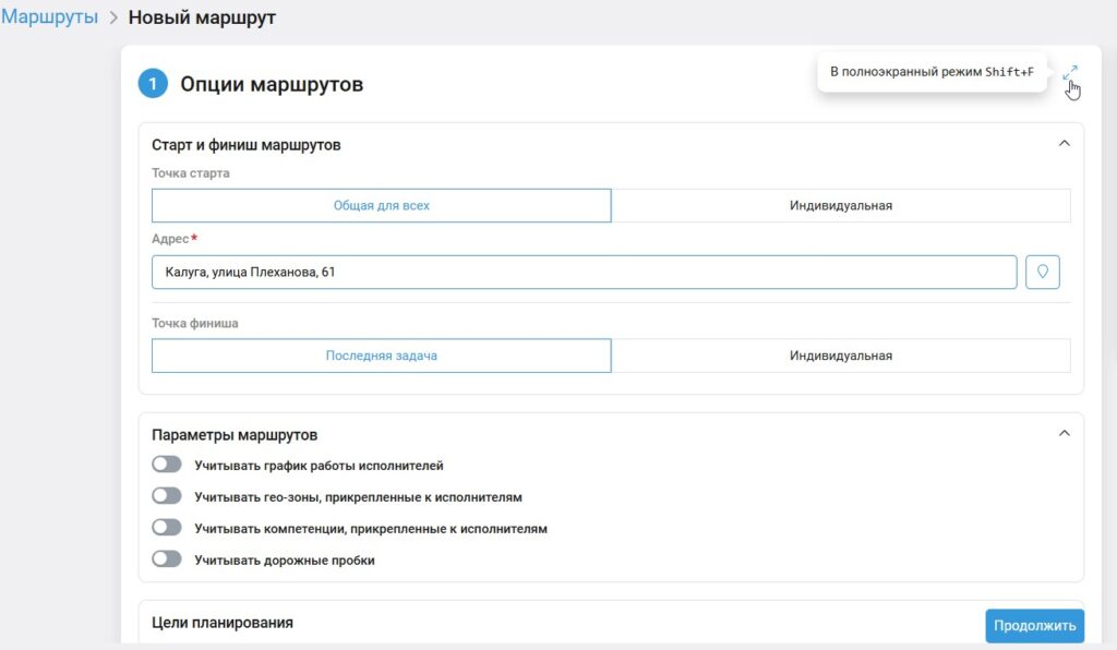 Теперь при настройке параметров маршрута каждый шаг можно развернуть на весь экран, чтобы было удобнее работать и все информация, параметры помещались на экран. Для этого в правом верхнем углу шага нажмите соответствующий значок или Shift+F. Таким же способом можно выйти из полноэкранного режима.