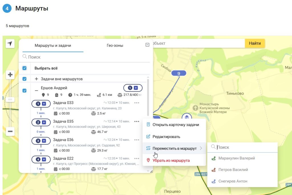 - в списке маршрутов раскройте нужный маршрут, напротив нужной задачи нажмите … → Переместить в маршрут и выберите нужного сотрудника;