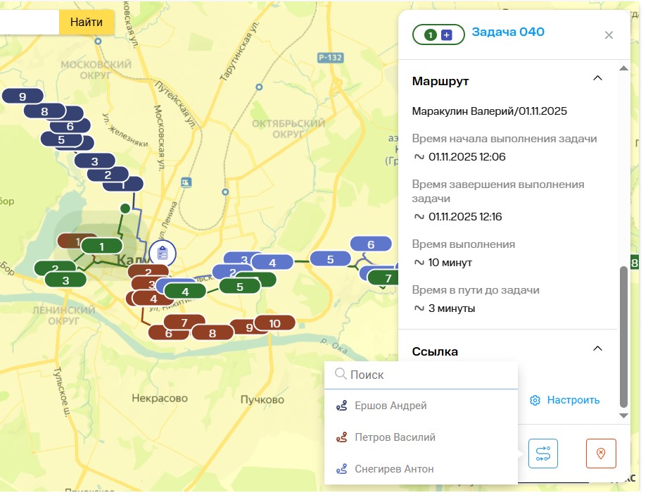 - на карте зажмите задачу и перетащите ее в маршрут другого сотрудника. Маршрут, в который вы перетаскиваете задачу, отобразится более заметно, а цвет значка задачи изменится на цвет нового маршрута.