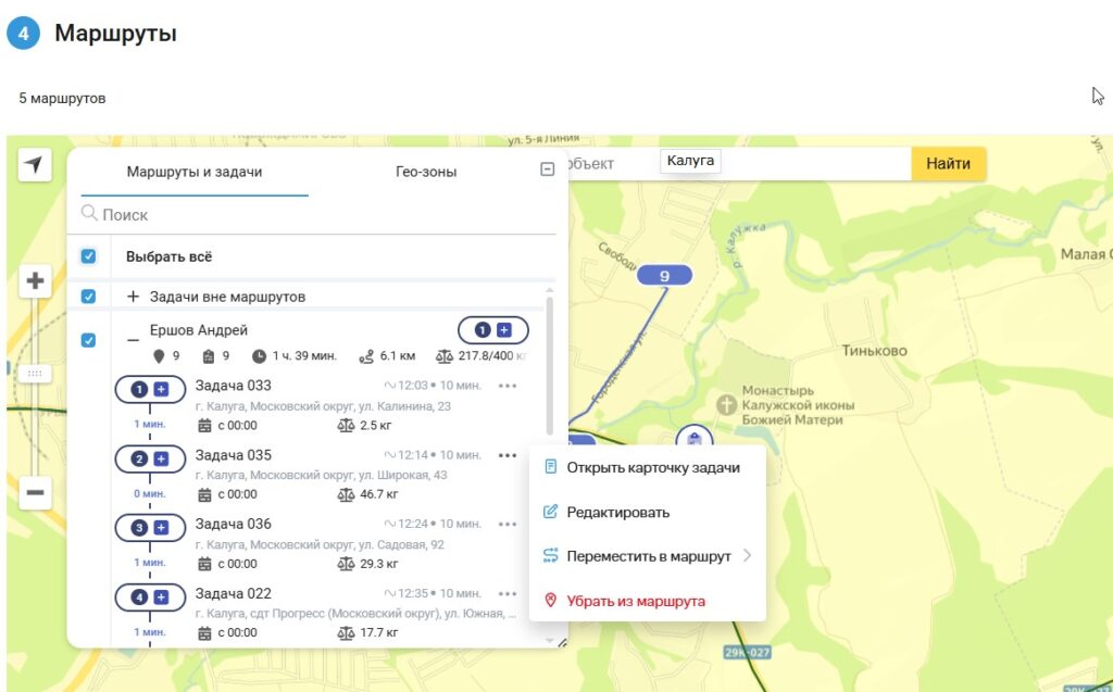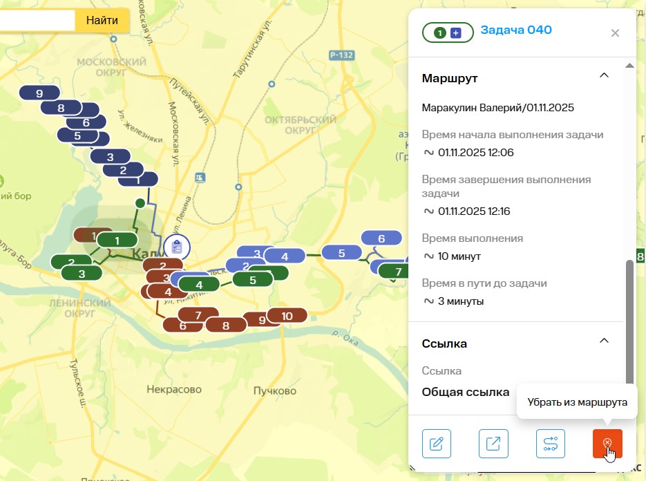 - в списке маршрутов раскройте нужный маршрут, напротив нужной задачи нажмите … → Убрать из маршрута.