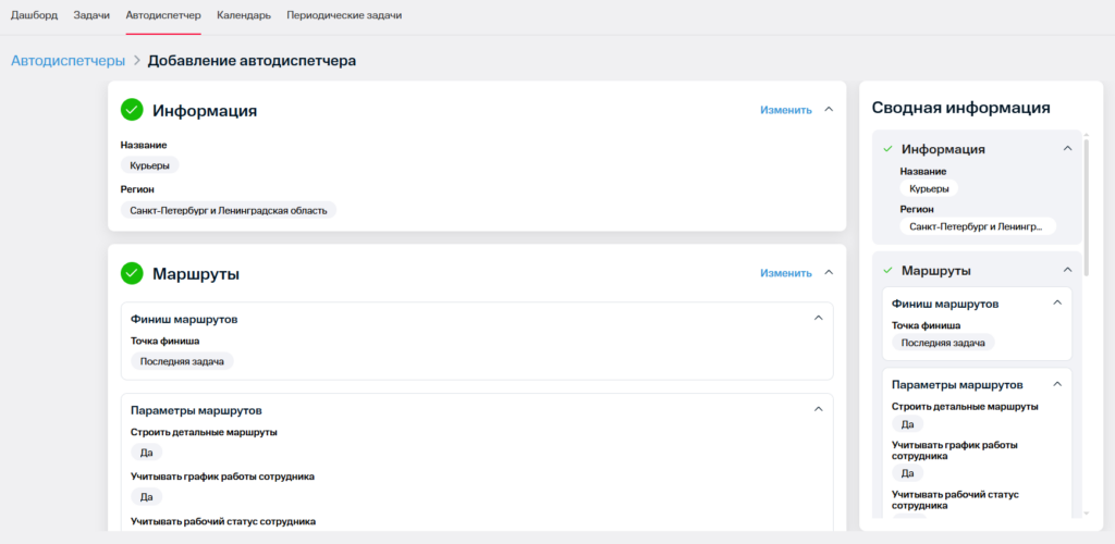 Теперь все настройки автодиспетчера находятся на одном экране и разбиты по шагам. Это делает настройку понятнее и быстрее: не нужно переключаться между вкладками, видно, какие шаги уже настроены, а какие нет.