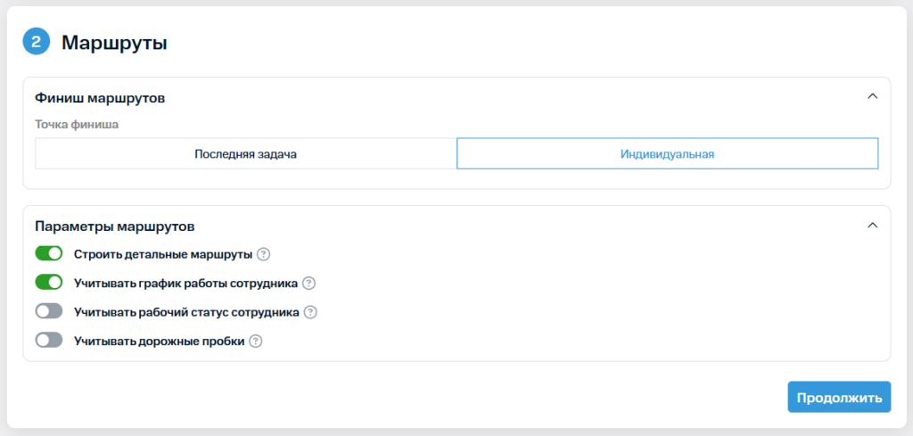 - настроить точку финиша, где должны заканчиваться маршруты, — на последней задаче или на конечной точке работы, указанной в настройках каждого сотрудника;