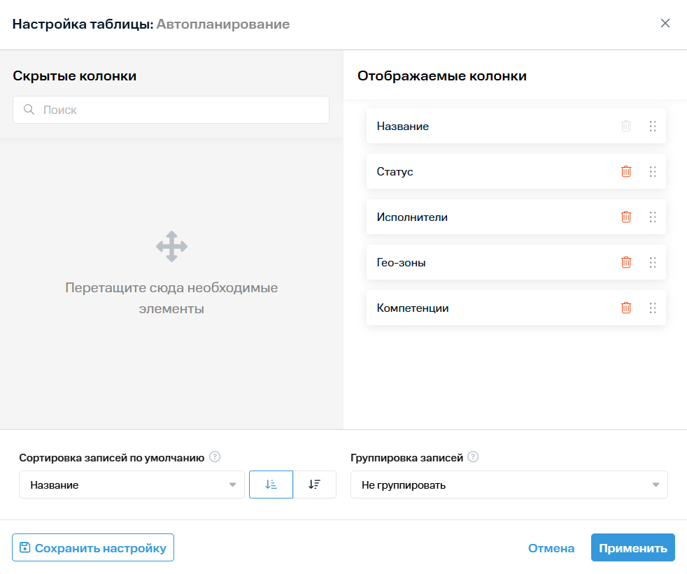 - список автодиспетчеров можно настроить — выбрать, какая информация должна отображаться, в каком порядке, как должны группироваться записи. Так в списке будет отображаться только нужная вам информация.